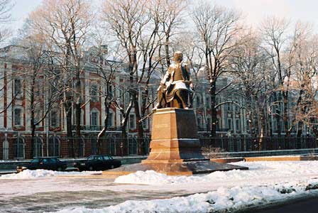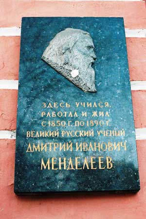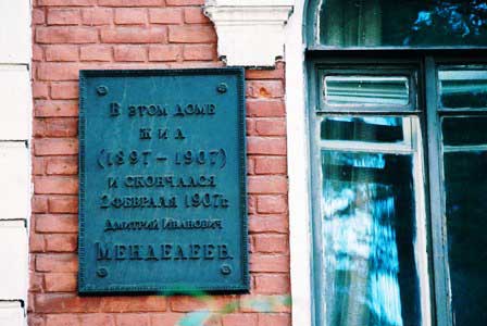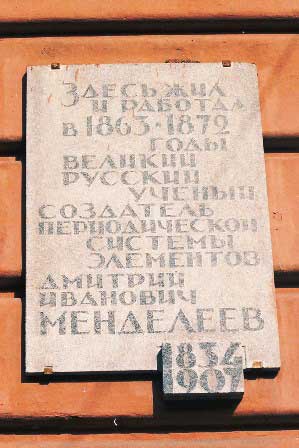 建物の入り口にはメンデレーエフの銘板がある。 (1996年12月撮影)追記; 1998年1月に、小原信利さんからのメールで、大学前の銅像は間違いなくロモノーソフのだと教えていただきました。ここをクリックしていただくと小原さんご自身が撮影されたもっと鮮明なロモノーソフ像をご覧いたただけます。