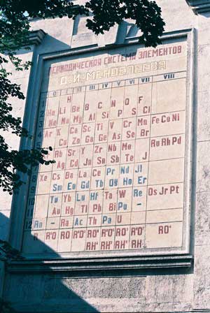 その銅像の脇の建物(おそらく学校であろう)の壁に大きく描かれた元素の周期表。 (1988年8月撮影)