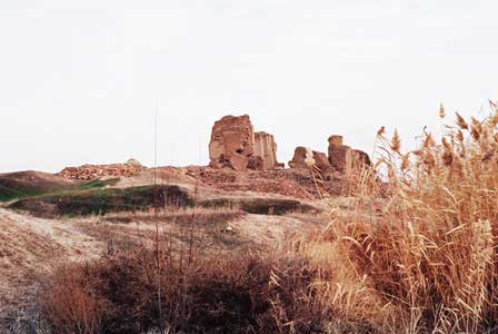 アシハバード郊外にあるパルティアの遺跡だが、日干し煉瓦の建築物群のため崩壊が著しい。 (1991年12月撮影)