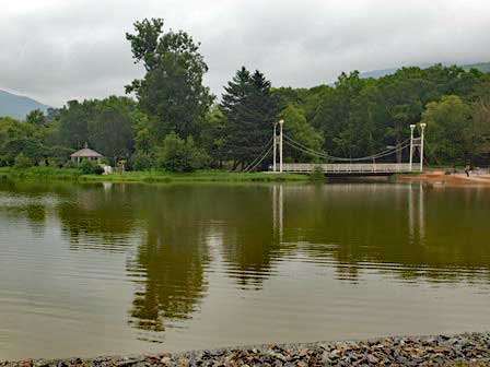 公園内には、かつて王子製紙が川をせき止めて貯水池にしたというヴェルフネエ湖(旧・王子ケ池)があり、その周囲を子ども鉄道の線路が囲んでいる。この子ども鉄道は、創設から65周年を迎えたという横断幕が出ていたが、残念ながら私がここに行ったのは朝と夕方だったので、実際に列車が走行しているのを見ることはできなかった。 (2019年8月撮影)