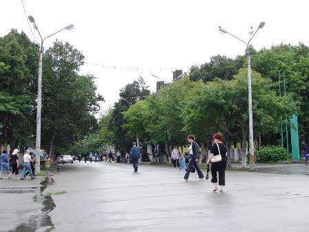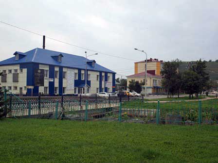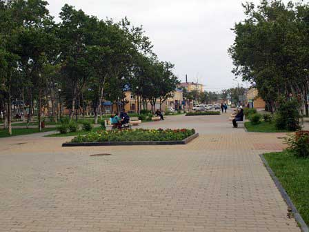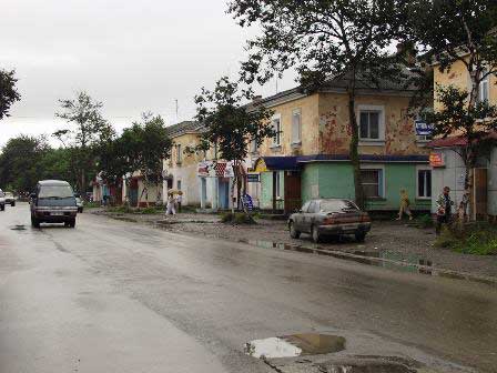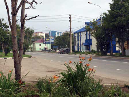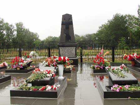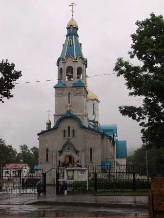 何年か前、サハリン州知事と側近の乗ったヘリコプターがカムチャッカで墜落するという事故があり、知事らは亡くなった。その墓が教会の裏手にあって、今でもたくさんの花が捧げられていた。 (2006年8月撮影)