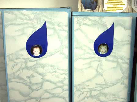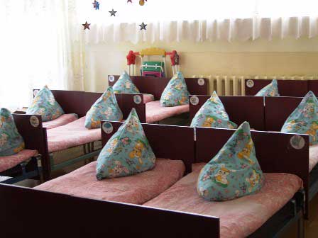 市内にある幼稚園の一つ。右下の写真は子どもたちが登園してきたときに荷物を入れるロッカーだが、使うのが学齢前の子らだから、その扉に名前の文字を書くのではなく一人一人の子の写真を貼るという配慮に感心させられた。写真ではないが、ベッドに貼られた丸いシールも同じ役目だろう。 (2006年8月撮影)