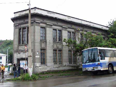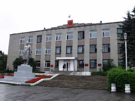 島の南にある港町コルサコフの市役所。正面に立っているのは、もちろんレーニン像。 (2006年8月撮影)