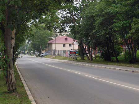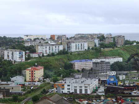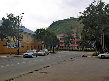 コルサコフは起伏に富む地形で、小高い丘の上にも住宅などの建物が多い。写真は港を見下ろす丘の上に建つ住宅群。 (2006年8月撮影)
