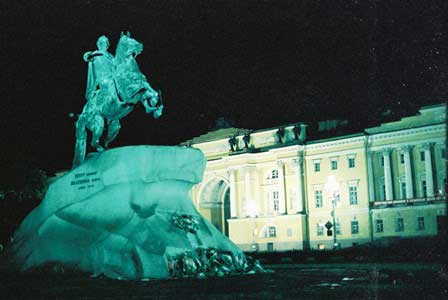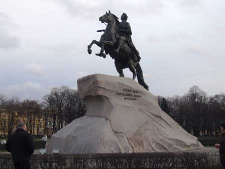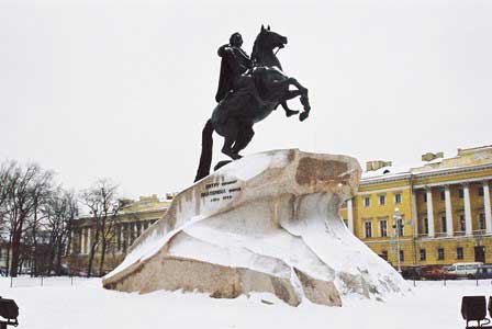 ネヴァ河畔デカブリスト広場にあるピョートル1世記念像。台座には「ピョートル1世に捧ぐ。エカテリーナ2世。1782年」の文字がある。フランスの彫刻家ファルコーネの作。 (上左:1997年12月,同右:1984年8月,下:2011年12月撮影)
