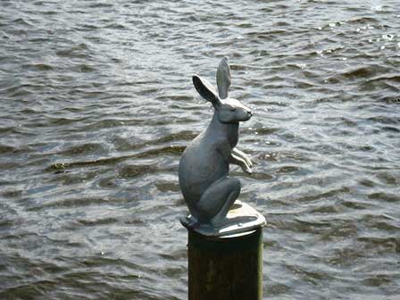 濠の中に兎のモニュメントが建っているのは、ここが「兎島」と呼ばれているからか。 |  |