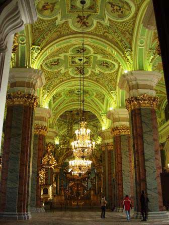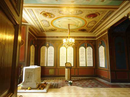 | 要塞の中には立派な教会があり、そこに歴代の皇帝が葬られている。下段の写真は、最後の皇帝ニコライII世一家の墓所で、これは歴代皇帝の墓とは別室にある。 (上段左端および下段:2013年8月,上段中および右:2005年4月撮影)