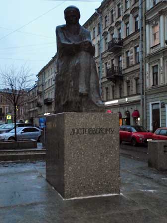 文豪F.M.ドストエフスキーの像。地下鉄ドストエフスカヤ駅を出てすぐ、ドストエフスキー博物館の近くにある。 (2020年2月撮影)