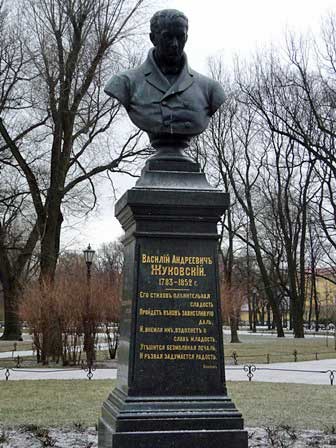 トマス・グレイ作「墓畔の哀歌」をはじめ大量のヨーロッパ文学をロシア語に訳したことで知られる詩人V.A.ジュコフスキーの像。旧海軍省に隣接するアレクサンドロフスキー庭園にある。 (2020年2月撮影)