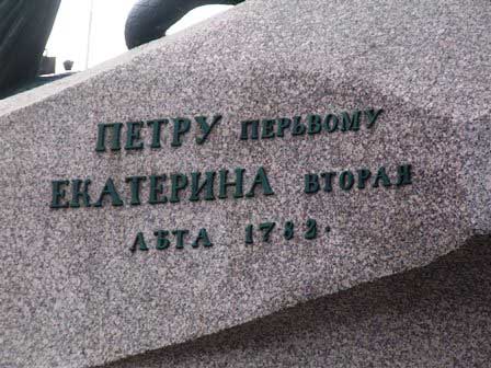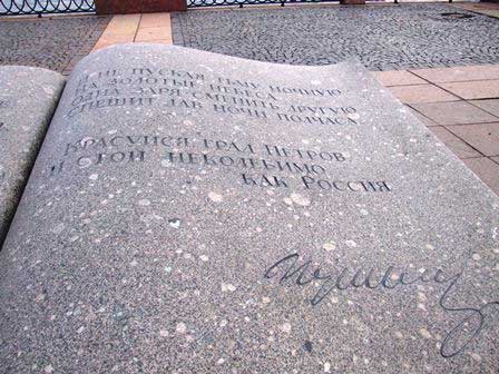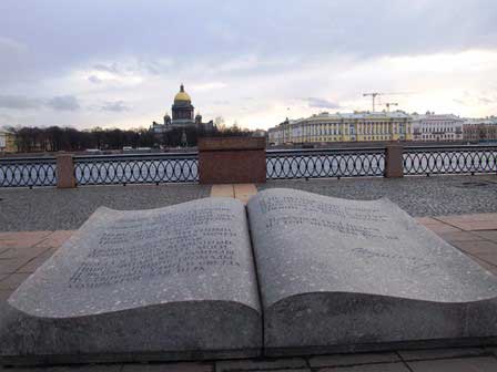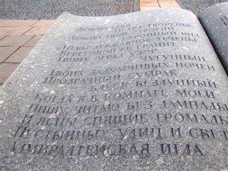 上の青銅の騎士像のちょうど正面、ネヴァ河の対岸に、A.S.プーシキンの有名な詩「青銅の騎士」の碑が置かれている。 (2011年12月撮影)