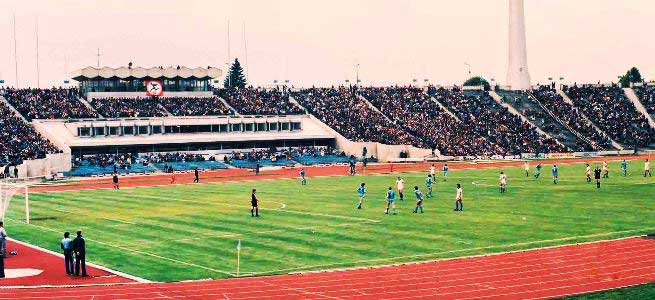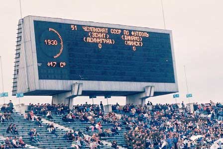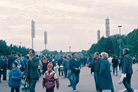 ロシアにおけるサッカーは日本の野球に相当する? 試合のある日には競技場行きの臨時バスも出るし、競技場にはピロシキ売りやらいろいろなグッズを売る店も立つ。試合が始まればみんなもちろん地元のチームを応援しており、ボールが相手方のゴールを脅かすあたりまでくると一斉に「ダバイ、ダバイ!」の大合唱だ。こんなところでビジター側を応援するのなんて名古屋や甲子園でジャイアンツを応援するのより難しい。 (1988年8月撮影)