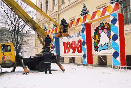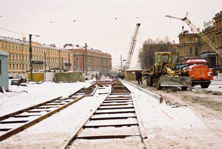 工事中の写真2枚。上はネフスキー通りで新年を迎える準備をしているところ。右はモイカ運河の北側で市電の敷設工事をしているところ。市電のレールをこうやって敷くとは知らなかった。(1997年12月撮影)