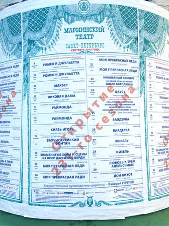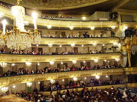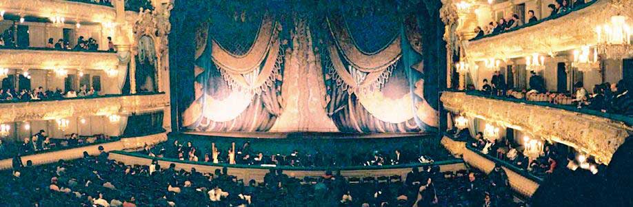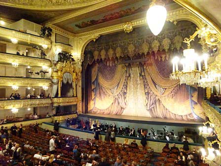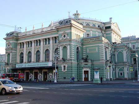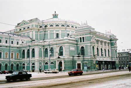 かつての帝室マリインスキー劇場。ソ連時代にはキーロフ劇場とよばれていたので、海外などでは、ソ連崩壊後しばらくは、そのほうが通りがよかった。劇場の内装でさえボリショイの「金」に対してキーロフの「銀」、同様に「赤」に対して「青」と非常にライバル意識があるとされたが、その後の一時期、両者のバレエが相互乗り入れ公演をしたとかで話題になっていたこともある。ロシアの古典バレエやオペラの多くはここで初演されている。 (1段目:1986年12月,2段目左:1997年12月,同中及び右:2013年8月,3,4段目:2016年12月撮影)