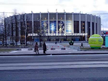 ペトログラード地区にある大小のアリーナやスケートリンクを持つ複合施設。スポーツ競技の他に、コンサートや展示会にも使われるという。「ユビレイ」というのは「周年」の意味で、この施設は1967年に十月革命50周年を記念して建設されたとか。 (2020年2月撮影)