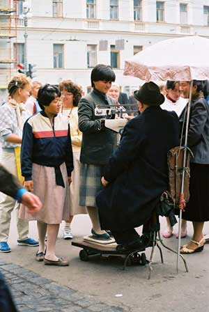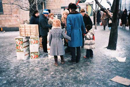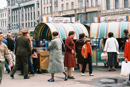 街角の風景。左は、真冬にエジプトからの柑橘類を売っていた露店。今では珍しくもないが、ソ連時代にはもう見つけたらすぐに買うのが鉄則だった。右は、やはりかつてはよく見かけた体重計り屋さん。計った体重を小さな紙片に書いてくれて何カペイカという料金だった。他人の見ているところで体重計に乗るのが前提のこの商売は日本なら開店2日目で倒産だろう。中央は、ゴスチヌィ・ドヴォールの前に出張っていた露店。ペレストロイカの頃からこういうちょっと小奇麗な露店を見るようになった。 (左:1985年12月,中及び右:1987年8月撮影)
