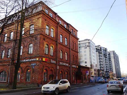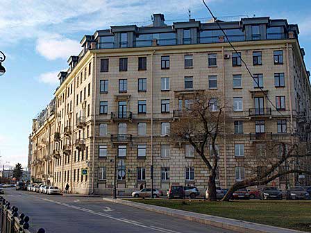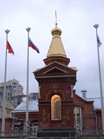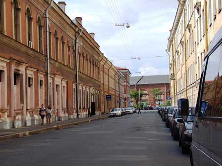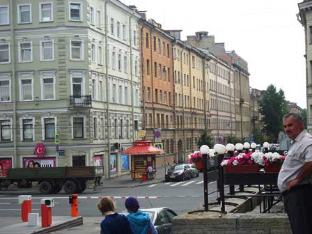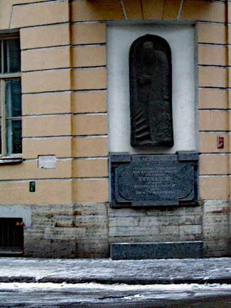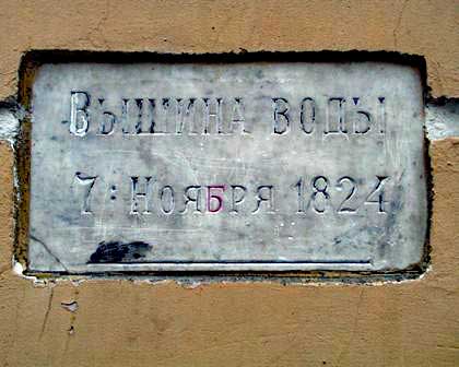 ペテルブルクは町の創建以来幾度も高潮による洪水に見舞われてきた。左の写真は、ことに被害が深刻だったとされる1824年の洪水で、水位がここまで達したということを示すプレート。下方の細い横線がその最大水位。プレートは、ドストエフスキーの小説『罪と罰』の主人公ラスコーリニコフの下宿があったとされる建物の壁に取り付けられていた。右の写真のうち、大きなレリーフとその下の銘板は、この建物がラスコーリニコフの下宿だったということを示していて、その左側にこのプレートが小さく見える。 (2000年12月撮影)