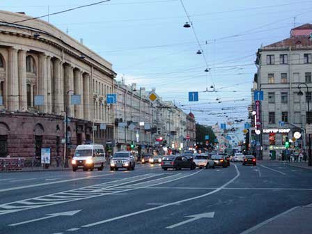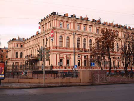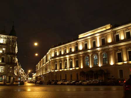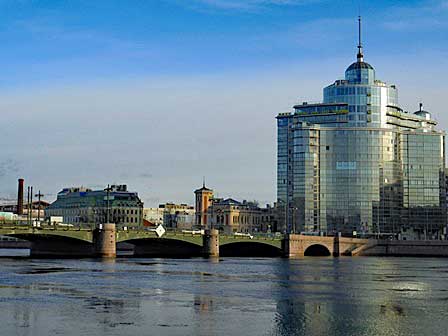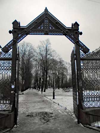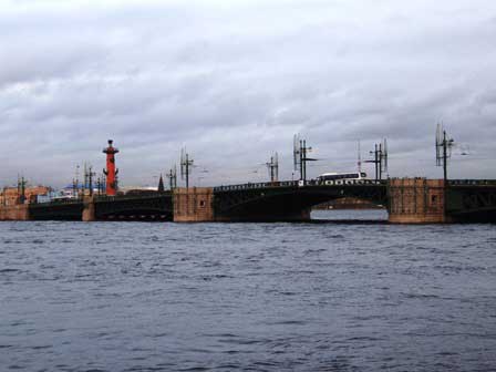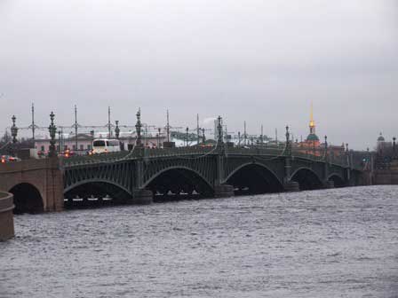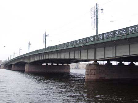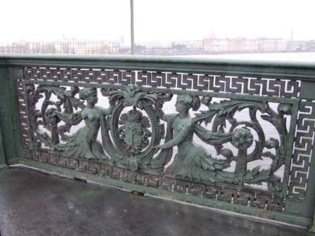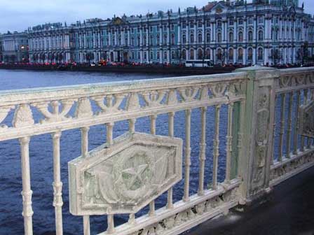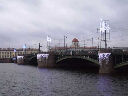 ペテルブルク市内には、ネヴァ川にかかるものだけでも、何本もの橋がある。橋によっては、欄干に綺麗な透かし彫りがあったり、夜になると電飾が点いたりと、きれいなのもある。 (2011年12月撮影)