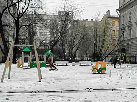 市内で見かけた子ども広場。入口の構えはいかめしいが、中を見ると建物に囲まれてはいないものの、ロシアの都会によくある中庭(ドゥヴォール)の風情。 (2020年2月撮影)