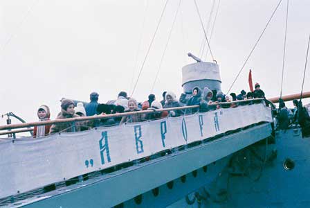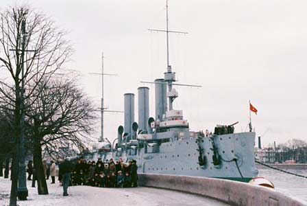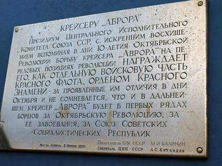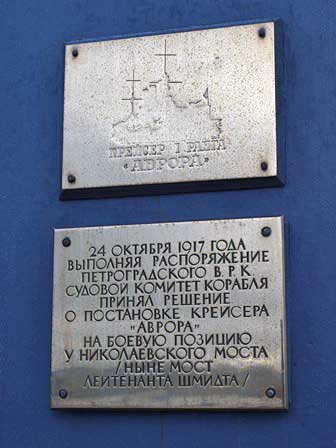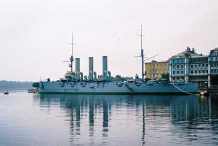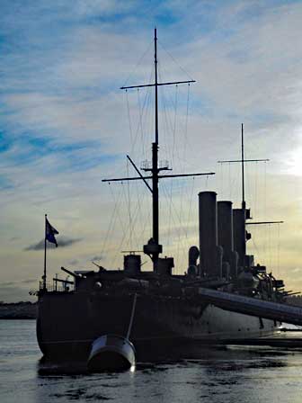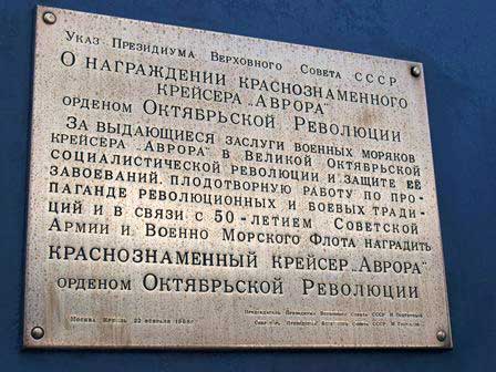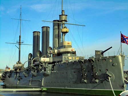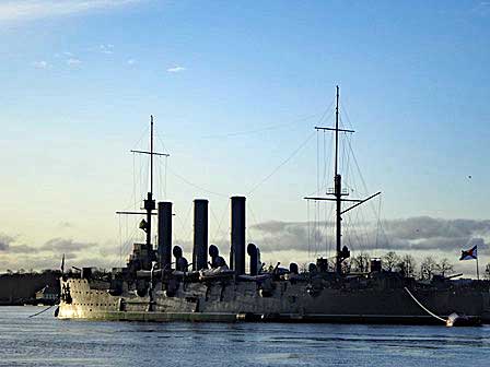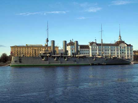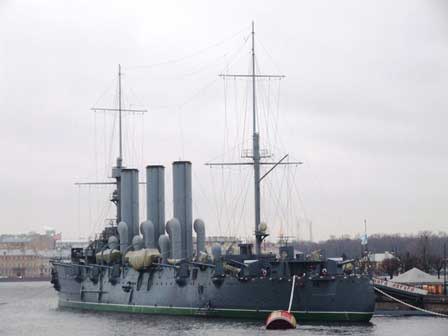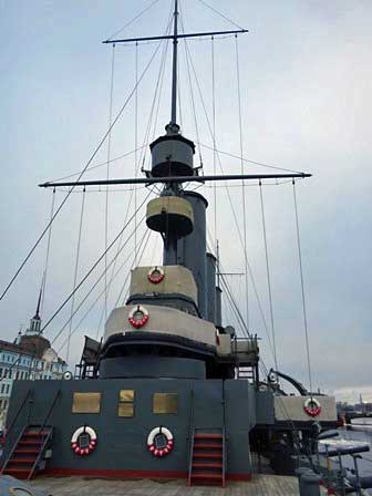 1917年11月7日(露暦10月25日)21時45分、ネヴァ川のニコラエフスキー橋のそばに錨をおろしていたオーロラ号の6インチ砲の発砲により、冬宮襲撃が開始されたことで知られる。ソ連時代はレニングラード(当時)へやってくるピオネールの団体などが必ず見学していく場所の一つであった。 (最上段中;2011年12月,同左右:2020年2月,二・三段目左及び中:1987年12月,二段目右:2020年2月,四段目左:1998年8月,同中及び右:2020年2月,五,六,八段目:2020年2月,七段目:1987年12月撮影)