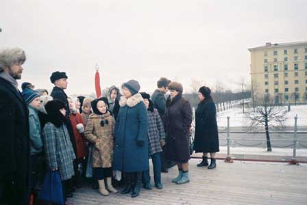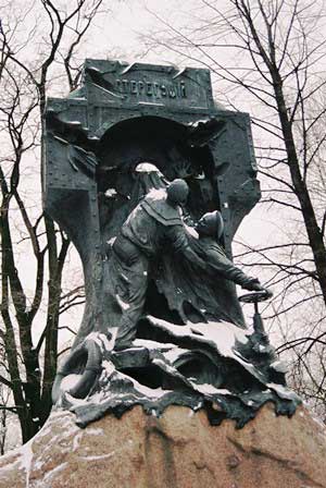 地下鉄ゴーリコフスカヤ駅近くの広場にある銅製の記念碑。日露戦争の開戦直後の時期、日本艦からの攻撃を受けて沈みゆく艦内で生きるために必死に闘う水兵を描いている。 ....と書いたが、どうもそうではなくて、損害を受けた艦が日本軍に捕獲されるのを防ぐため、弁を開いて自沈させる水兵を讃えたものだそうだ。 (1999年12月撮影)