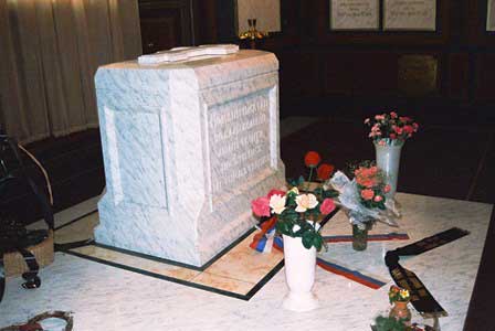 遺骨がウラル地方エカテリンブルクで発見されたというロマノフ朝最後の皇帝ニコライII世の墓所。ピョートル大帝以降の歴代皇帝の眠るペトロパブロフスク聖堂内にあるが、いっしょに並べられているわけではなく別室。 (1998年8月撮影)