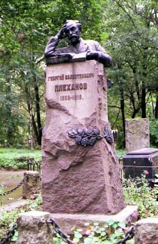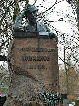 10月革命以前のロシアの社会主義思想家プレハーノフの墓。同じくヴォルコヴォ墓地にある。手にしている本には「マルクス」の文字が刻んであった。日本との関係で言うと、1904年8月、第二インターナショナルのアムステルダム大会の冒頭、彼は当時日露戦争で交戦中の相手国日本の社会主義者片山潜と握手を交わして互いに強い反戦の意思を示したことでよく知られる。 (左:2020年2月,右:1995年8月撮影)