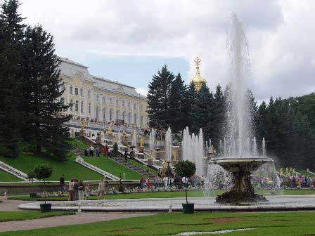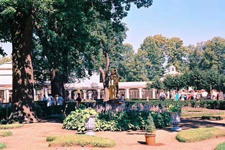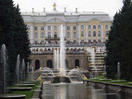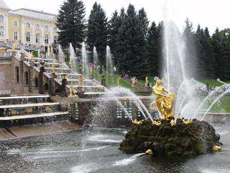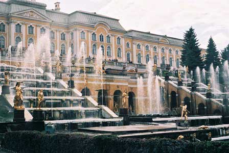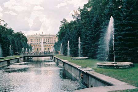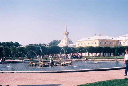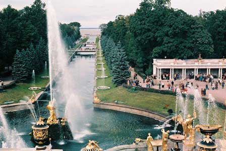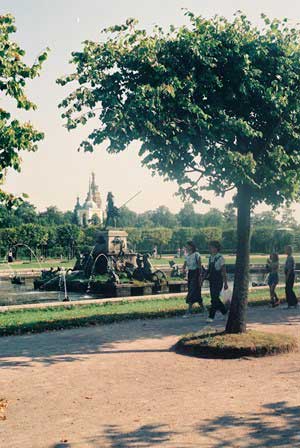 ペテルブルク市の西方、クロンシュタット島に近いフィンランド湾の南岸にあるピョートル大帝の夏の宮殿。「上の公園」「下の公園」とよばれる広大な庭園があり、ことに下の庭園は様々な噴水で有名。 (上3枚:1984年8月,下3枚1996年8月撮影)