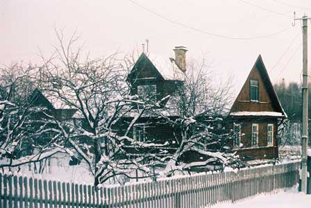 ペテルブルクというのはモスクワと比べると市街地の面積のそう大きくない都市で、都心から少し走るともうこのような建物ばかりになる。市の南側プーシキン市に近いあたり。 (1986年12月撮影)