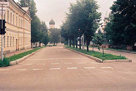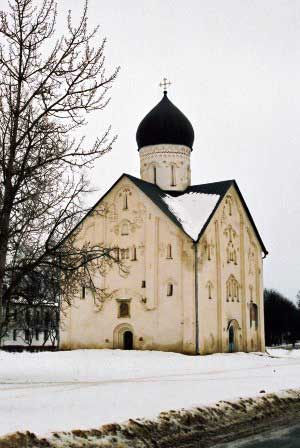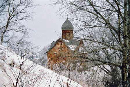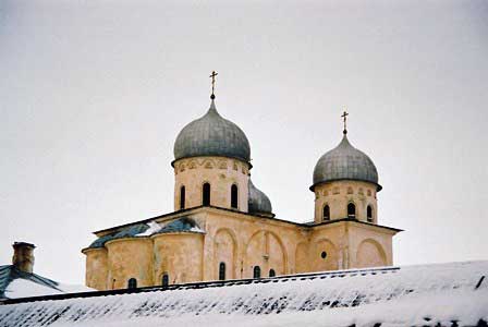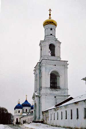 ノブゴロド空港のほうへ向かうバスで郊外に出るとヤロスラフ賢帝が1030年に建てたと言われるユーリエフ修道院に行くことができる。 ちょうどこの写真を撮った時、塔に一人の男の人が登ってずいぶん長い間鐘を鳴らし続けていた。 (1997年12月撮影)