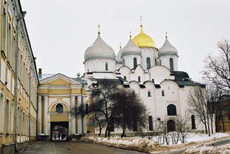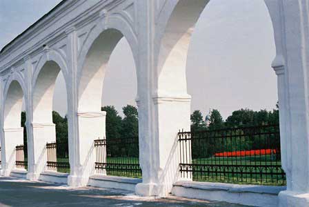 ヴォルホフ川をはさんでクレムリンの対岸の位置に「ヤロスラフの宮廷」とよばれる一角がある。かつて市場が置かれ盛んな交易が行われた場所と言われる。そこにのこるアーケード様の建築物。 (1988年8月撮影)