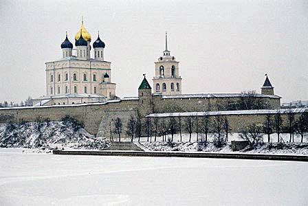 プスコフ市の中心部、ヴェリカヤ川の川岸に造営されたクレムリンとその城壁の中にそびえるトロイツキー聖堂。(1999年12月撮影)