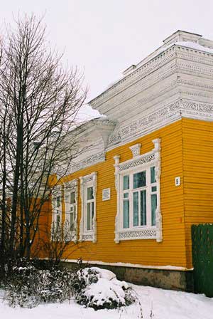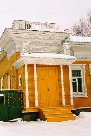 ヴォログダ市内で見かけたこの住宅は、窓の周囲もさることながら、軒下にまるでレース編みを思わせるような繊細な細工をしてあった。 (1999年12月撮影)