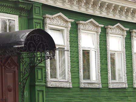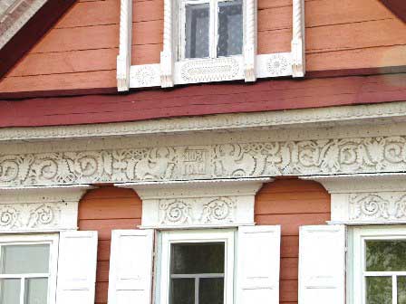 ゴロジェッツ ボルガ河沿いの町、ゴロジェッツの街中で見た建物。べつだん博物館仕立てにしているわけではないが、通りにはこうした綺麗な建物がいくつもある。 (2007年8月撮影) 前のページへ 次のページへ 目次へ戻る 軒下の飾り ヴォログダ市内で見かけたこの住宅は、窓の周囲もさることながら、軒下にまるでレース編みを思わせるような繊細な細工をしてあった。 (1999年12月撮影) 前のページへ 目次へ戻る