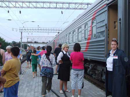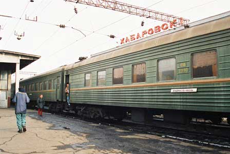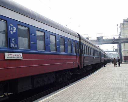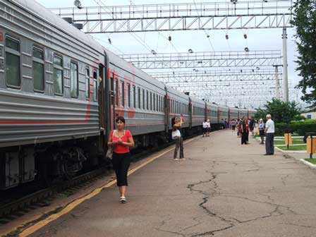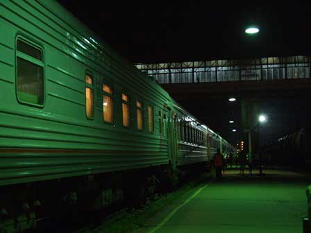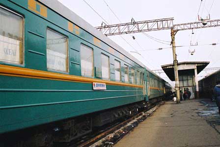 モスクワへ向けて出発準備中の急行列車「ロシア」。かつて、この列車は赤色の車体で、「赤い流星」というニックネームで呼ばれたりもしたものだが、今はご覧の通りの三色。どうしても国旗の色にしたいらしい。 (2001年3月撮影)