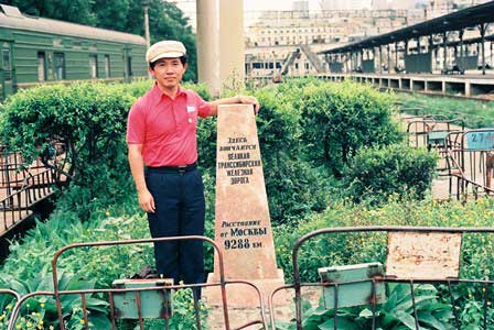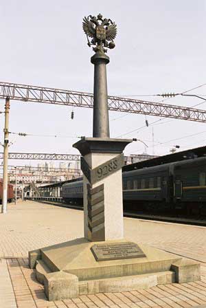 駅のプラットホームの端にこの碑があった。モスクワまで9千キロ余の旅の始まり。もっとも碑文のほうは「大シベリア横断鉄道がここで終わる」となっているが。 (1991年8月撮影)