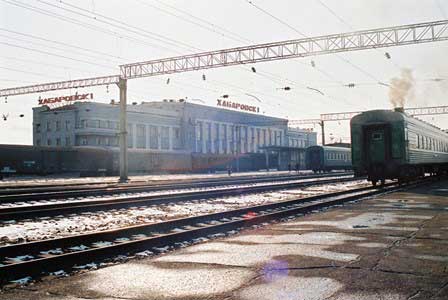 シベリア鉄道の要衝、ハバロフスク駅。駅舎についている時計をよく見ると短針が2つあるのがわかる。鉄道はすべてモスクワ時間で運行するので、赤い短針でそのモスクワ時間を表す。また、この駅のように駅舎とプラットフォームが地下道でつながれているのは、シベリア鉄道中でもよほどの主要駅だけだ。写真の上中段と下段では「ハバロフスク」という駅名の書体が異なることにお気づきだと思うが、この間に駅舎が建て替えられたからだ。左上は、建て替えられた後の駅舎正面。 (上段左端:2012年8月,それ以外の上・中段:1999年3月,下段:2013年8月撮影)