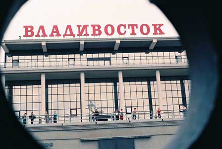 新潟から船で行くとウラジオストクへは30時間足らずで着く。これは東京港から釧路へ行くのとほぼ同じ程度の時間だし、東京から那覇へ行くのよりはずっと短い。ロシアはそんなに近い隣国なのだ。写真は、船底に近い下級船室の丸窓から見えたウラジオストク港のターミナルビル。このビルの裏手にシベリア鉄道のウラジオストク駅がある。 (1991年8月撮影)
