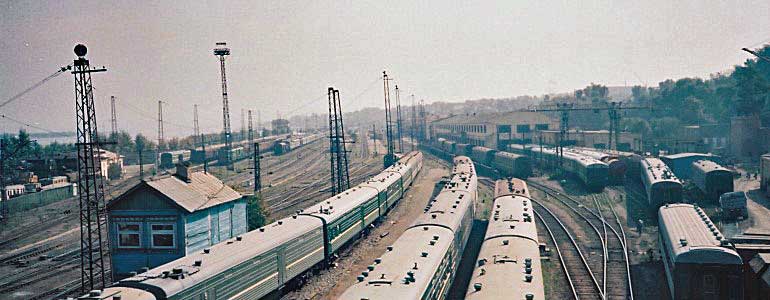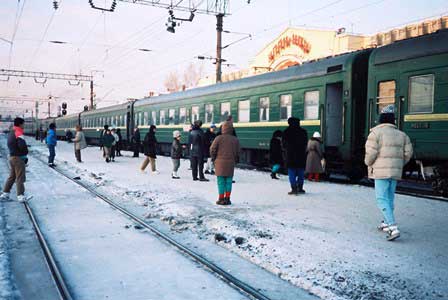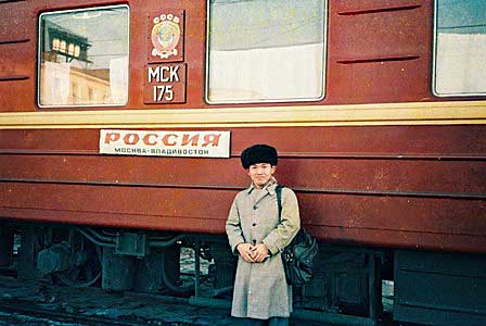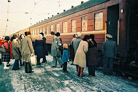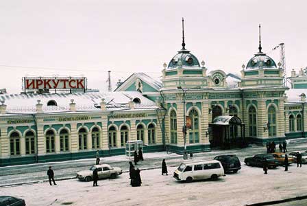 シベリアのパリともよばれるイルクーツク。その旅客駅はパステルカラーのあか抜けしたターミナルビルで昔からよく知られていた。もう一つの特徴は、ロシアの駅舎の看板はプラットホーム側にはその都市名(駅名)が書いてあるが町を向いている側にはただ「駅」と素っ気なく書いてあるのが普通(しかしその町の人にとってはそれでじゅうぶん用が足りる)なのに、ここではしっかり「イルクーツク」と書かれていることだ。この町はロシアの極東や中国、朝鮮、モンゴルなどとモスクワを結ぶ交通の要衝であり、そのことは線路が錯綜している上段右の写真からもうかがい知ることができる。下段は同駅に停車中のモスクワ発ウラジオストク行き急行「ロシア」への乗車前に撮影したもの。 (上段左:2001年3月,同右:1983年8月,下段:1984年3月撮影)