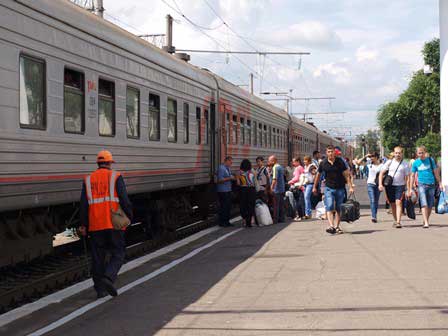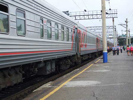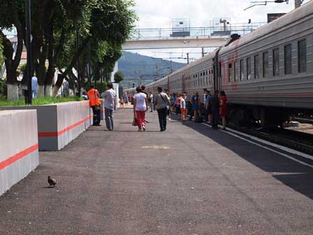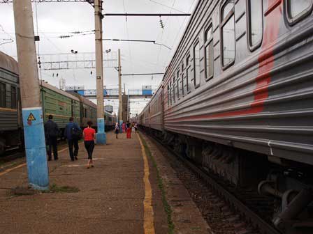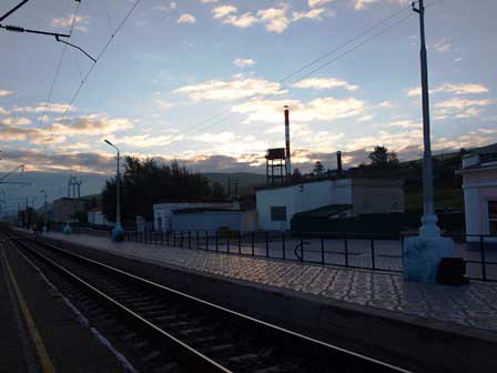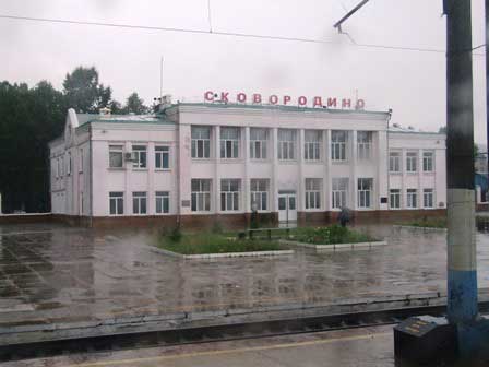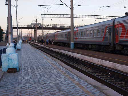 同じように、ホームにただ列車が停まっている写真では、どこの駅でも同じに見えるけど、実際は、ハバロフスクから1000kmほど進んだところにある駅。町はアムー州に属する。ホームをまたぐ跨線橋が設置されていることから、それなりの「主要」駅だとわかる。 (2013年8月撮影)