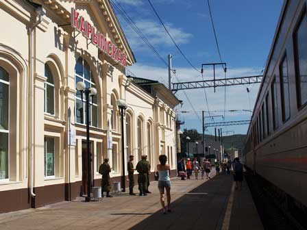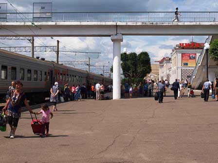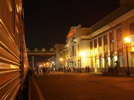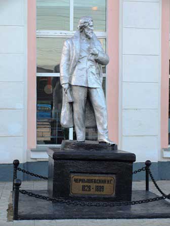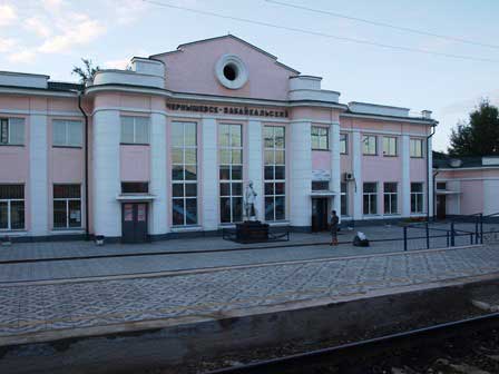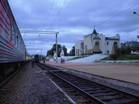 駅舎の正面に銅像のあるチェルヌィシェフスキーは小説「何をなすべきか」でよく知られる作家で、流刑にされてシベリアで長く生活したことがある。 (2013年8月撮影)