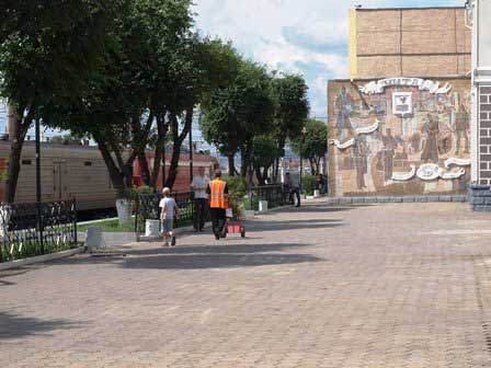 エロフェイ・パヴロヴィチというのは、もちろん人名で、姓はハバロフ。つまり、ハバロフスク駅前に大きな銅像になっている人物。ハバロフスクは、彼の姓をとって地名としているが、この町は、名と父称とで地名になっている。 (2013年8月撮影)
