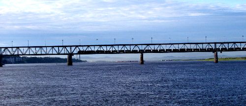 アムール川にかかるシベリア鉄道の鉄橋。シベリア鉄道での輸送にとってこのアムール越えの部分がネックになっていると言われ、この橋のほかに川底をくぐるトンネルもある。写真では橋のむこう側がハバロフスク市の中心部。 (2002年8月撮影)