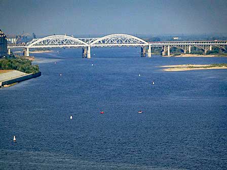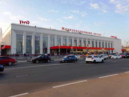 ニジニ・ノヴゴロドは、上のヤロスラヴリと同じく、東のウラル側からモスクワに向かう列車がヴォルガを渡る位置にある都市。現在では、急行ロシア号はヤロスラヴリやセルギエフ・パッサートを通らず、ニジニ・ノヴゴロドを経てウラジーミルを通るルートでモスクワのヤロスラヴリ駅に向かう。左はニジニ・ノヴゴロドの鉄道駅。駅舎の上にある横長の文字列は文字通り「鉄道駅」。右はヴォルガを渡るボルスキー橋。2本の橋が平行に架かっていて、しかも鉄道と自動車道の2層構造になっている。 (2018年9月撮影)