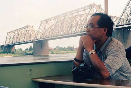 ヤロスラヴリはヴォルガ河畔の町で、モスクワへ向かう列車は駅の直前でヴォルガの鉄橋を渡る。このあたりのヴォルガはもうかなりの上流だが、それでも川幅が1kmに近い。写真はヴォルガにかかるシベリア鉄道の鉄橋の下を小さな遊覧船でくぐり抜けているところ。 (1990年8月撮影)