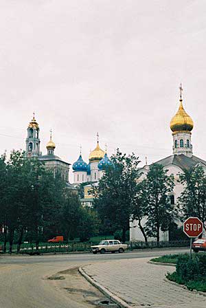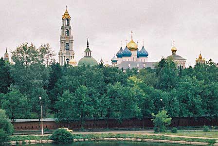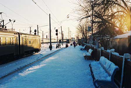 急行ロシア号がヤロスラヴリ経由だった時期、右手にトロイツェ・セルギエフ大修道院の金色の葱坊主が見えれば、ウラジオストクから始まった列車の旅もまもなく終わりとわかり、乗客達はそろそろ下車の準備を始めたものだった。右端の写真は、セルギエフ・パッサート駅のプラットホーム。時間帯にもよるがそれなりの本数の郊外電車がモスクワまで走っている。 (左・中:1995年8月,右:1995年1月撮影)