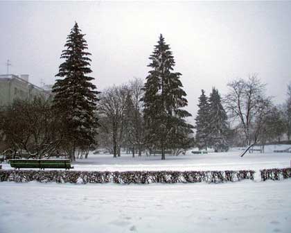東京都内のどこかの鉄道駅と言っても立派に通用しそうな、旧ソ連圏内とはとても思えぬ斬新なデザインの駅舎は2000年の暮れに完成したもの。待合室からプラットホームに出る通路はバリア・フリーのスロープになっていて、“動く歩道”も設けられていた。右の写真は、駅前に立てられた新年の飾り“ヨールカ”。 (2001年1月撮影)