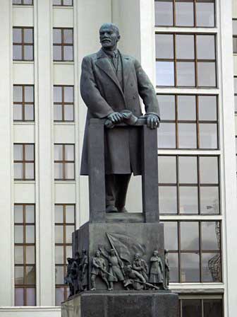 独立広場に立つレーニン像。現在でも健在。手すりのようなものにつかまる姿勢のレーニン像は、旧ソ連各地にあったものの中でも珍しいのではないか。 (2019年9月撮影)