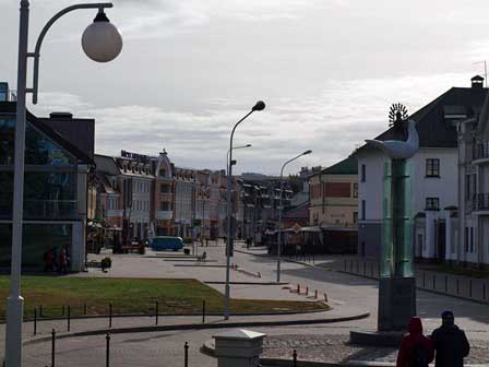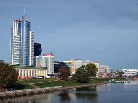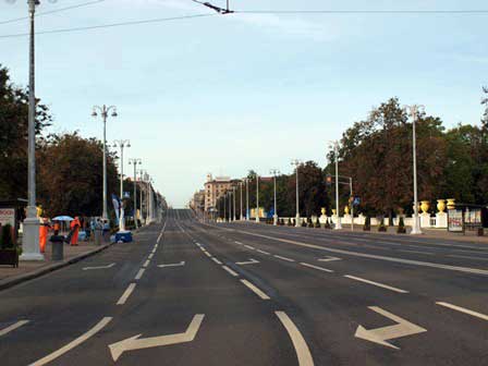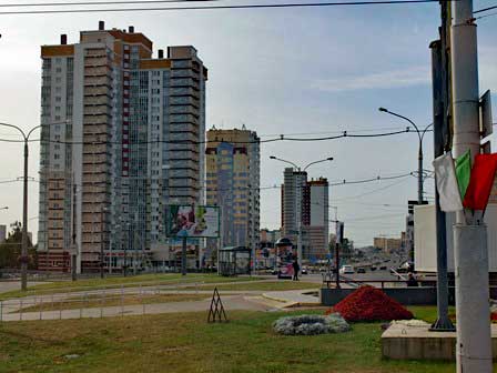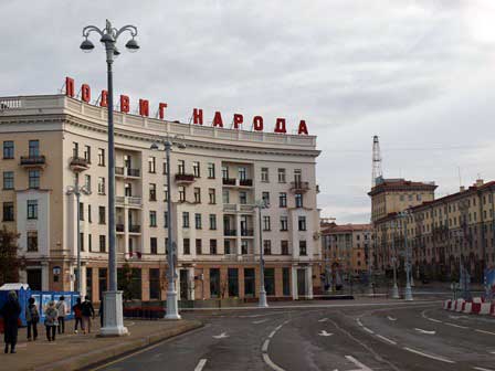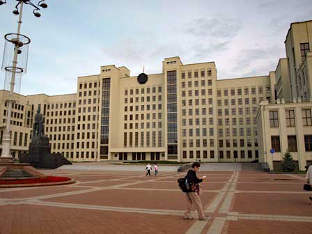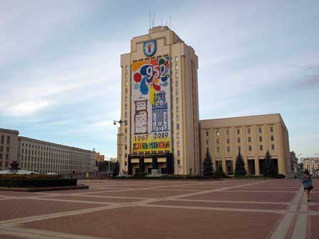 目次へ戻る現在のミンスクの中心地。広場の周りには、市庁舎、大統領府、中央郵便局などがある。 (2019年9月撮影)