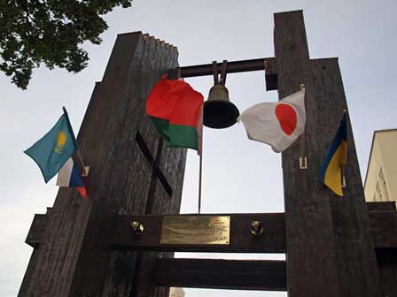 チェルノブイリ原発事故によって深刻な被害を受けたベラルーシの人々へ長崎の浦上天主堂から贈られた鐘。独立広場の聖シメオン・ヘレナ教会のすぐそばに立つ。挿されている5本の国旗は、核兵器やその実験、あるいは原発事故によって人々の生命が失われるという悲しい体験をした5ヶ国を指しているのだと思う。 (2019年9月撮影)