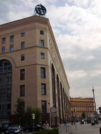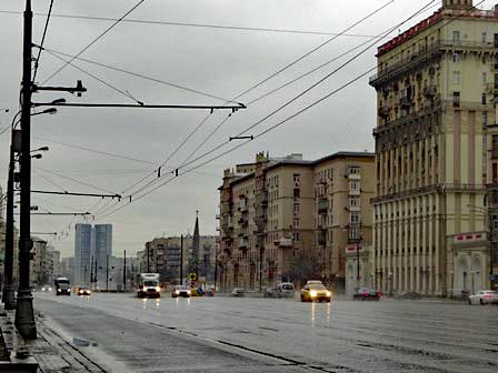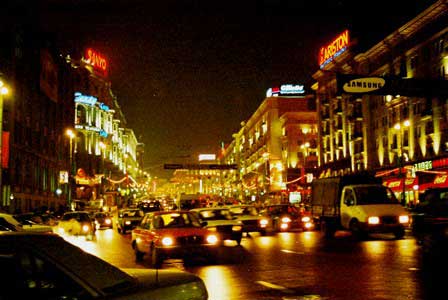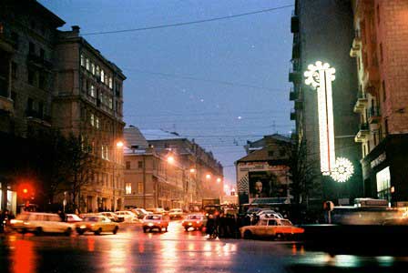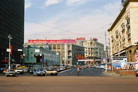 ソ連時代にはゴーリキー通りと呼ばれていたモスクワの繁華街の一つ。赤の広場を出たところから始まり、このまま市街を抜けるとレニングラード街道となってサンクト・ペテルブルクに達する。左の写真は夜景のように見えるが大晦日の日の朝8時過ぎに撮影したもの。 (左:1997年12月,右:同年8月撮影)